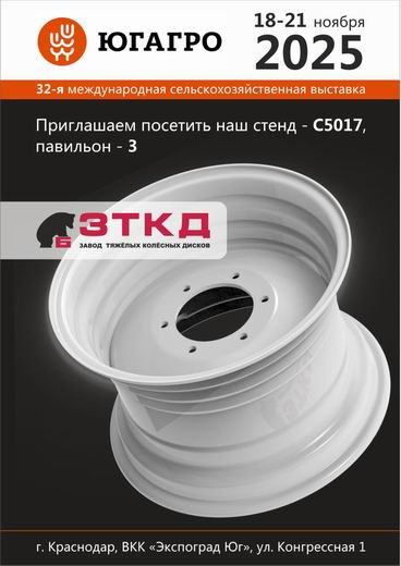 С 18 по 21 ноября 2025 года в ВКК «Экспоград Юг» (г.Краснодар) состоится 32-я Международная выставка ЮГАГРО. Завод тяжелых колесных дисков представит на ней колесные диски различных типоразмеров и системы сдваивания колес для тракторов.